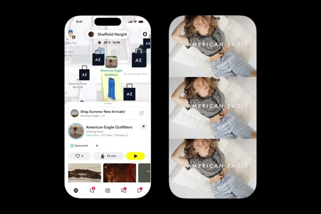 Snap Map позволява на потребителите да откриват локации в близост. С интеграцията на American Eagle, малки персонализирани икони отбелязват магазините на картата. При натискане, потребителят получава информация за конкретния обект, достъп до Stories, Spotlight съдържание от бранда и потребители, както и директен линк за пазаруване на ae.com.
