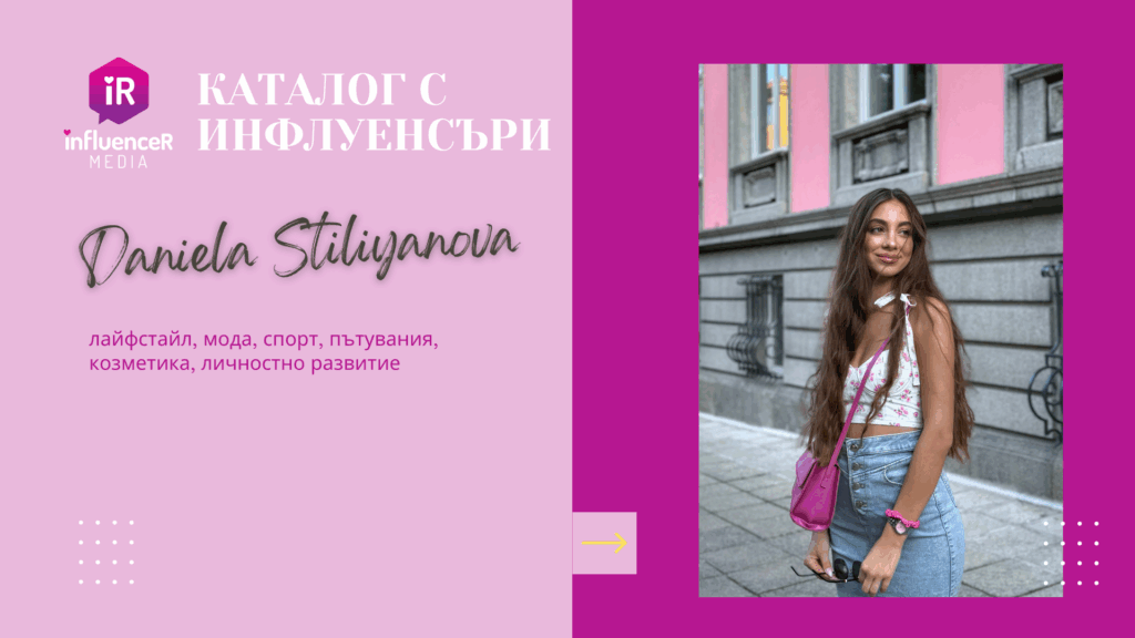 Име: Даниела Стилиянова Instagram профил: danielaque__ TikTok профил: danielaque_ YouTube: coming soon Портфолио: https://danielatsvetanova.my.canva.site/ Основни теми в комуникацията: лайфстайл, мода, спорт, пътувания, козметика, личностно развитие Брой последователи в Instagram: 1607 Брой последователи в TikTok: 1521 С какво се гордееш в работата ти с брандове: Гордея се с факта, че за малко повече от една година…