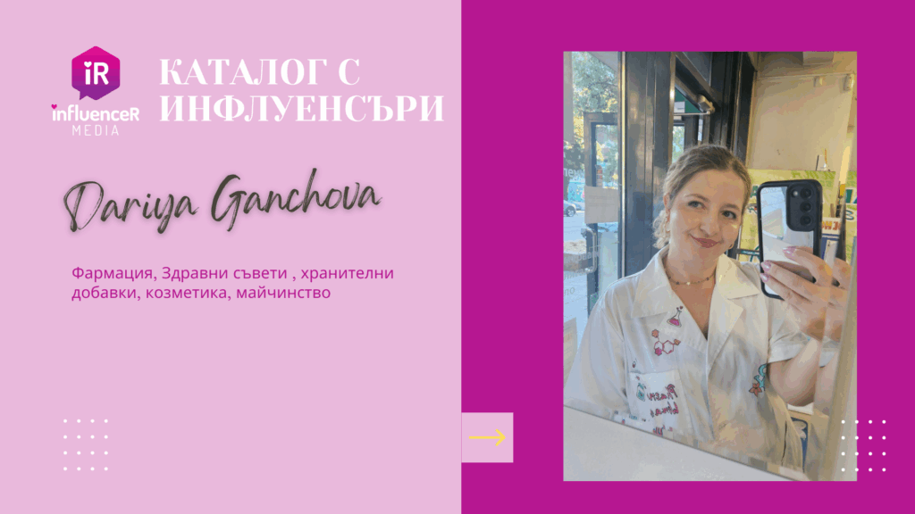 Име: Дария Ганчова Instagram профил: pharmawoman_ TikTok профил: PharmaWoman Основни теми в комуникацията: Фармация ,Здравни съвети , хранителни добавки,козметика , майчинство Брой последователи в Instagram: 1266 Брой последователи в TikTok: 33.7k Важно: Аз съм мама-фармацевт,активно работещ магистър-фармацевт, помагам на другите майки със здравни съвети,мнението ми за наличните продукти в аптеката и козметични съвети. Освентова показвам…