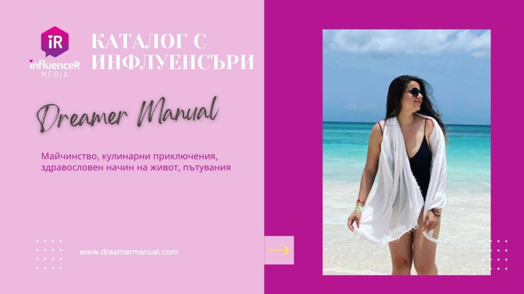 Име: Таня Григорова Instagram профил: Dreamer manual Facebook профил: Dreamer manual Основни теми в комуникацията: Истината за живота като майка; кулинарни приключения – бързи и лесни здравословни рецепти; здравословен начин на живот – веганство и хранене без глутен; пътувания; бременност, раждане и женско здраве. Брой последователи в Instagram: 2327 Брой последователи във Facebook: 1619 Блог:…