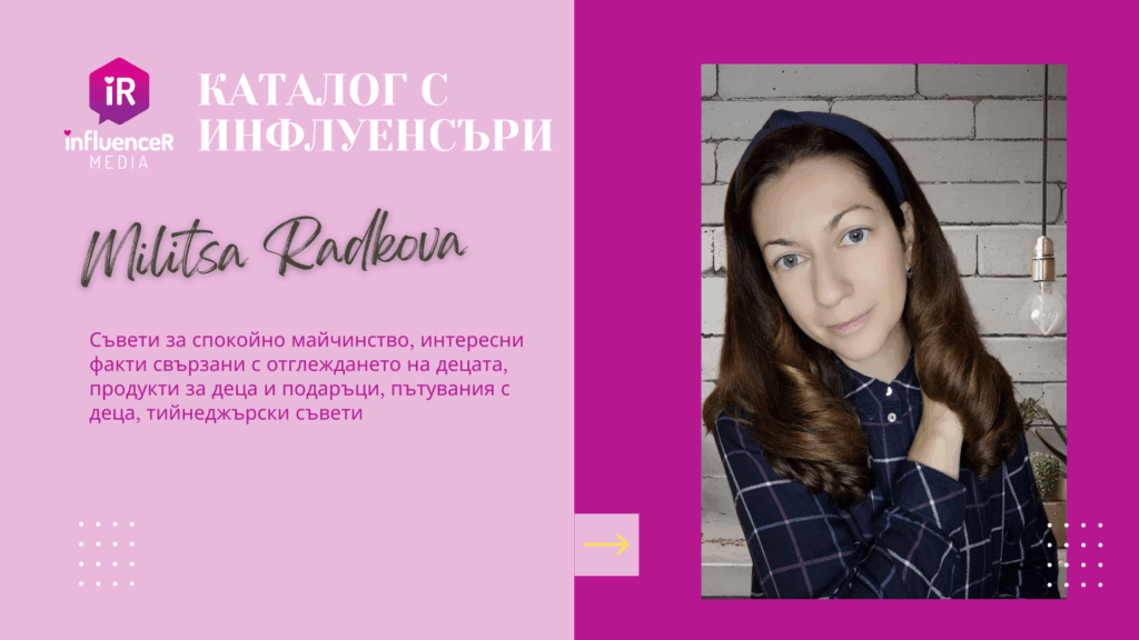 Име: Милица Радкова профил в Instagram: mmama_mili_vanili профил в TikTok: Mama Mili & Maksi профил в YouTube: Mama Mili & Maksi Основни теми в комуникацията: Съвети за спокойно майчинство, интересни факти свързани с отглеждането на децата, който да помогнат на майките да разбират по-лесно децата си, продукти за деца и подаръци, пътувания с деца, тийнеджърски…