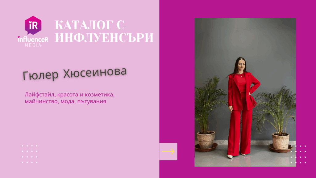 Име: Гюлер Хюсеинова профил в Instagram: gyuler.hyuseinova профил в TikTok: gyuler.hyuseinova Основни теми в комуникацията: Лайфстайл, красота и козметика, майчинство, мода, пътувания Брой последователи в Instagram:12К Брой последователи в TikTok: 23,7К С какво се гордееш в работата ти с брандове: Създавам автентично и доверено съдържание, което помага на хората да откриват качествени продукти и услуги.…