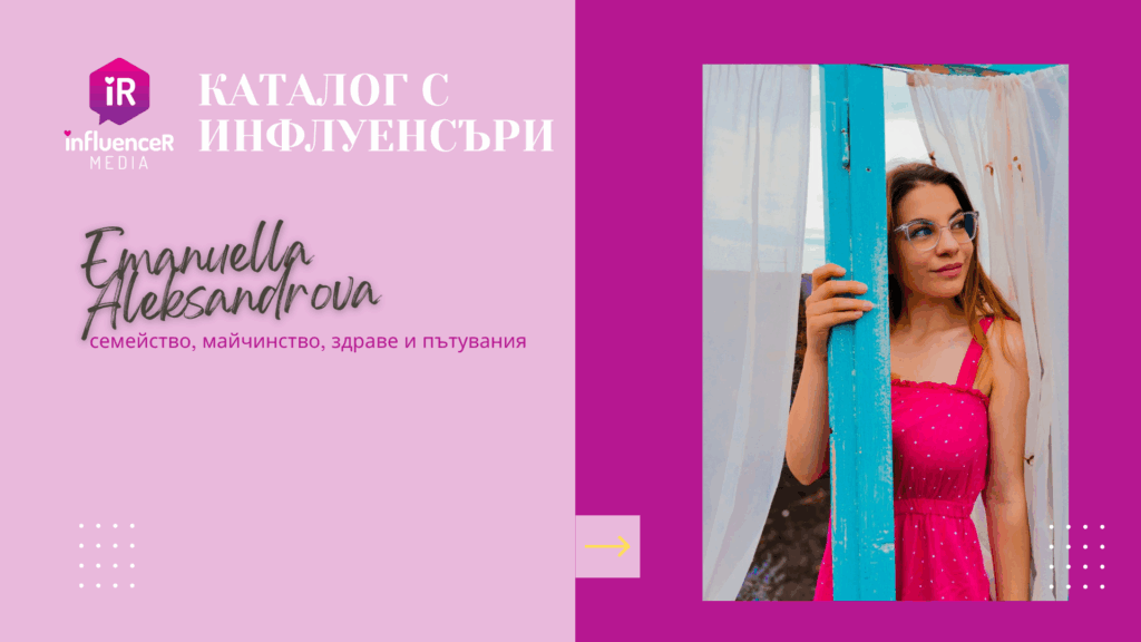 Име: Емануела Александрова Основни теми в комуникацията: семейство, майчинство, здраве и пътувания Профил в Instagram: emanuella.aleksandrova Брой последователи в Instagram: 2500 Коя агенция те представлява: Никой не ме представлява. Сама изграждам своя профил. Добави нещо, което ти е важно, но го няма в списъка горе: Живея в красивия град Бургас. Аз съм здравен работник по…