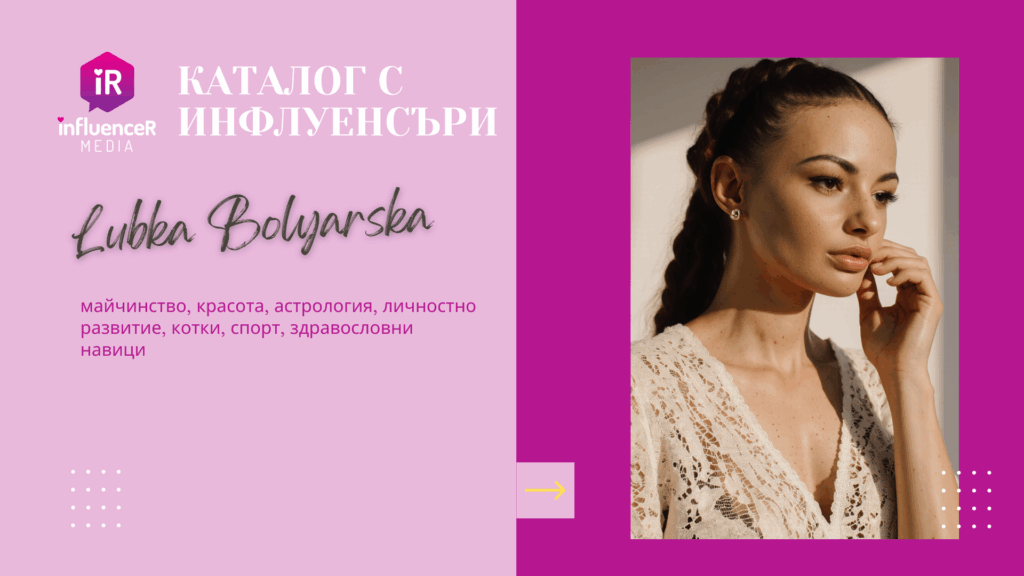 Име: Любка Болярска Профил в Instagram: astro_psychology_luba Основни теми в комуникацията: майчинство, красота, астрология, личностно развитие, котки, спорт, здравословни навици Брой последователи в Instagram: 11К С какво се гордееш в работата ти с брандове: Смятам, че най-голямото ми предимство в работата с брандове е това, че успявам да вмъкна техните продукти по автентичен начин в съдържанието…
