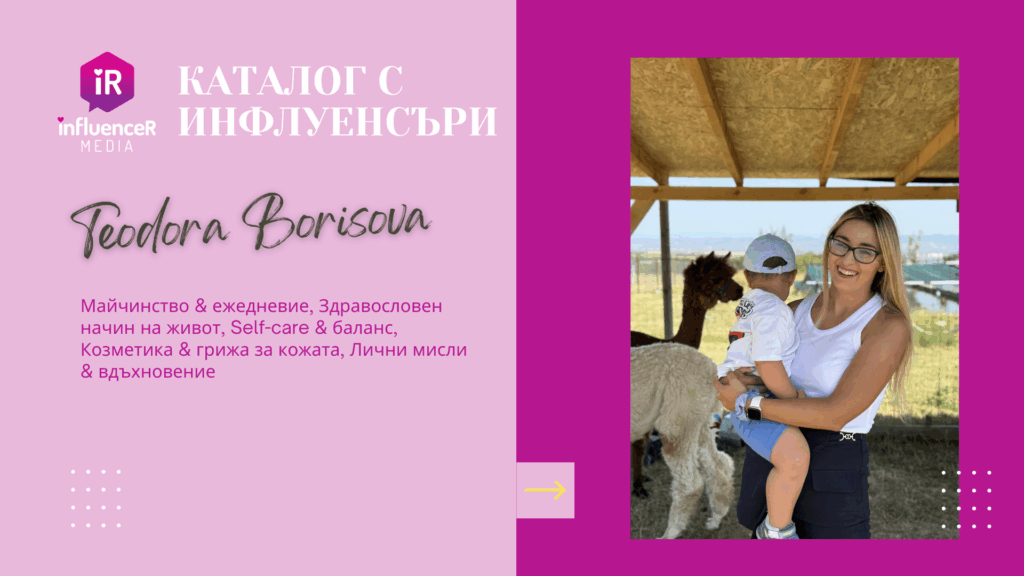 Име: Теодора Борисова Профил в Instagram: @teodora_kondova Профил в TikTok: @tedka_baby Основни теми в комуникацията: Майчинство & ежедневие, Здравословен начин на живот, Self-care & баланс, Козметика & грижа за кожата, Лични мисли & вдъхновение Брой последователи в Instagram: 2290 Брой последователи в TikTok: 759 портфолио С какво се гордееш в работата ти с брандове: Със…