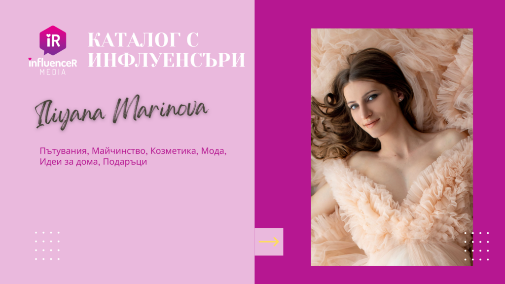 Име: Илияна Маринова Instagram профил: trips2beauty TikTok профил: trips2beauty YouTube профил: Iliyana Marinova Основни теми в комуникацията: Пътувания, Майчинство, Козметика, Мода, Идеи за дома, Подаръци. Брой последователи в Instagram: 1607 Брой последователи в TikTok: 2790 Брой последователи в YouTube: 529 С какво се гордееш в работата ти с брандове: Гордея се с това, че до момента винаги…