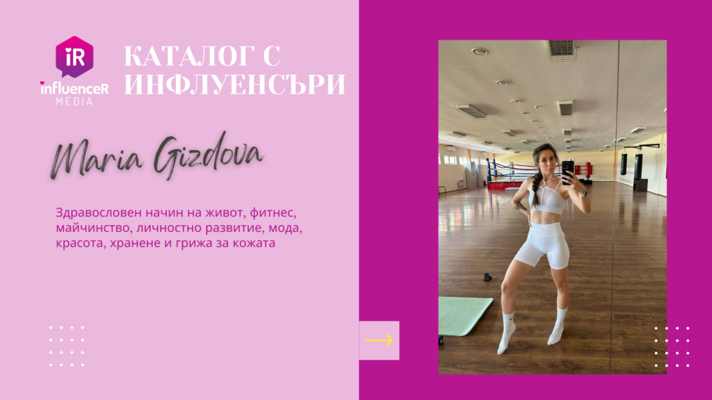 Име: Мария Гиздова Instagram профил: maria.gizdova TikTok профил: maria.gizdova Основни теми в комуникацията: Здравословен начин на живот, фитнес, майчинство, личностно развитие, мода, красота, хранене и грижа за кожата. Брой последователи в Instagram: 7063 Брой последователи в TikTok: 3380 С какво се гордееш в работата ти с брандове: Създавам съдържание, което е едновременно естетично и автентично, като…