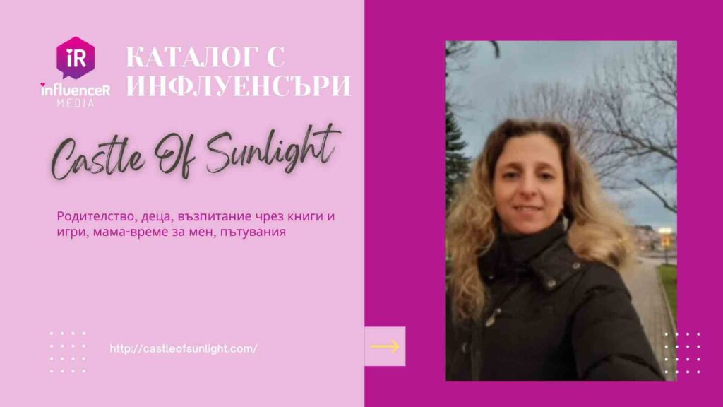 Име: Лора Instagram профил: CastleOfSunlight by Lora Основни теми в комуникацията: Родителство, деца – занимания, възпитание чрез книги и игри, мама – време за мен, пътувания Брой последователи в Instagram: 2500 Блог: http://castleofsunlight.com/ Гордост: Искреност и доверие; маркетингов поглед; идеи и съвети. Бизнеси, които предпочита: Търся дългосрочно партньорство, което да позволи на аудиторията ми…