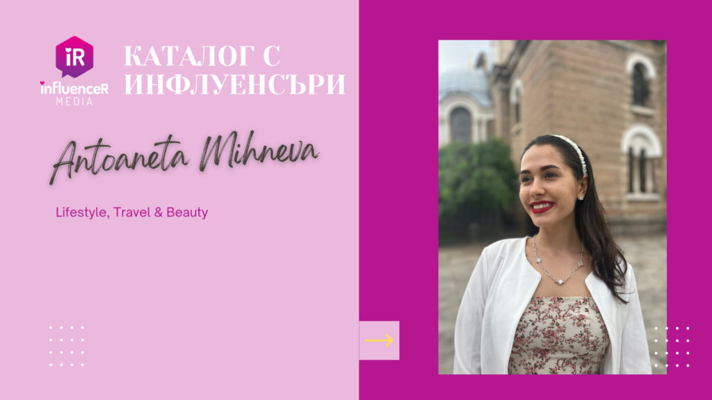 Име: Антоанета Михнева Instagram профил: tonny_stranger TikTok профил: tonny_stranger Facebook профил: Антоанета Михнева Основни теми в комуникацията: Lifestyle, Travel & Beauty Брой последователи в Instagram: 9010 Брой последователи в TikTok: 1461 Брой последователи в Facebook: 3.1k С какво се гордееш в работата ти с брандове: Гордея се с успешната комуникация междумен и бранда, умението ми…