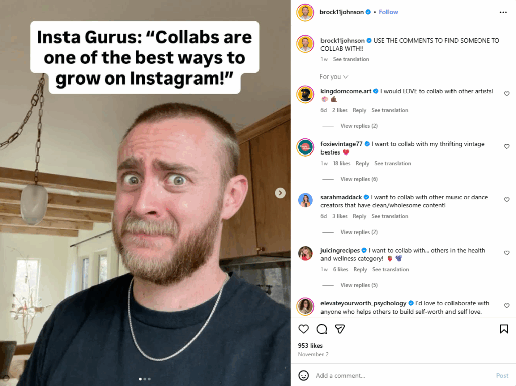 Коучът за растеж в Instagram, Brock Johnson, насочва работата си към малки бизнеси и създатели, които вече имат последователи — но искат повече от просто видимост: целят реални конверсии и приходи.