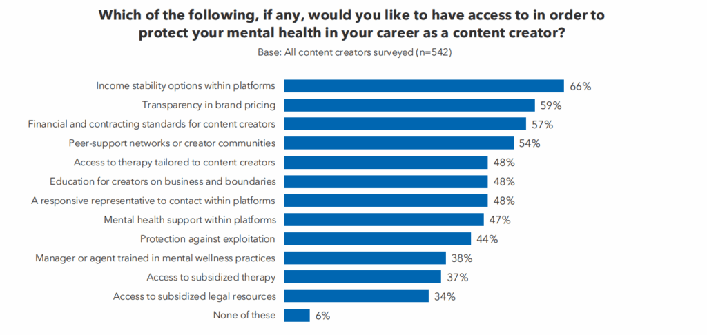 Сред най-често споменаваните нужди са по-стабилни източници на доход, по-ясни и прозрачни стандарти за работа с брандове, финансова и договорна сигурност, както и изграждане на общности за взаимна подкрепа. Достъпът до терапия и психологически ресурси, специално насочени към създатели на съдържание, също се посочва като ключов.