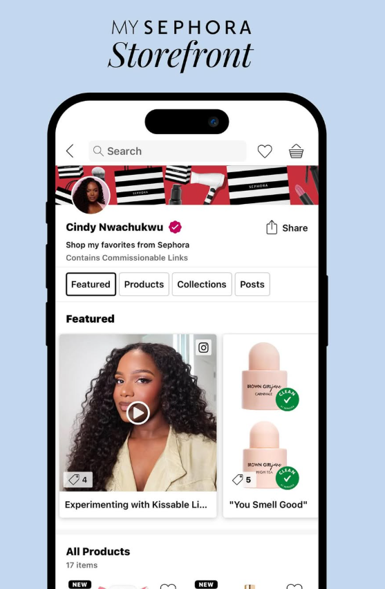 Когато става дума за affiliate продажби, Sephora се обръща директно към източника — към създателите на съдържание. Миналия месец брандът стартира програмата „My Sephora Storefront“, чрез която създатели могат да показват своите любими продукти на Sephora, да генерират споделяеми линкове за социални мрежи и да печелят комисионна от реализирани продажби.