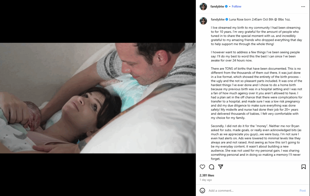 Раждането се проведе у дома, в надуваем басейн в дневната ѝ, а по време на целия стрийм Fandy беше подкрепяна от своя съпруг Адам (известен онлайн като “Adamax”) и екип за подкрепа. В последните минути новороденото се появи на екрана, предизвиквайки вълна от поздравления и емоции в чата.